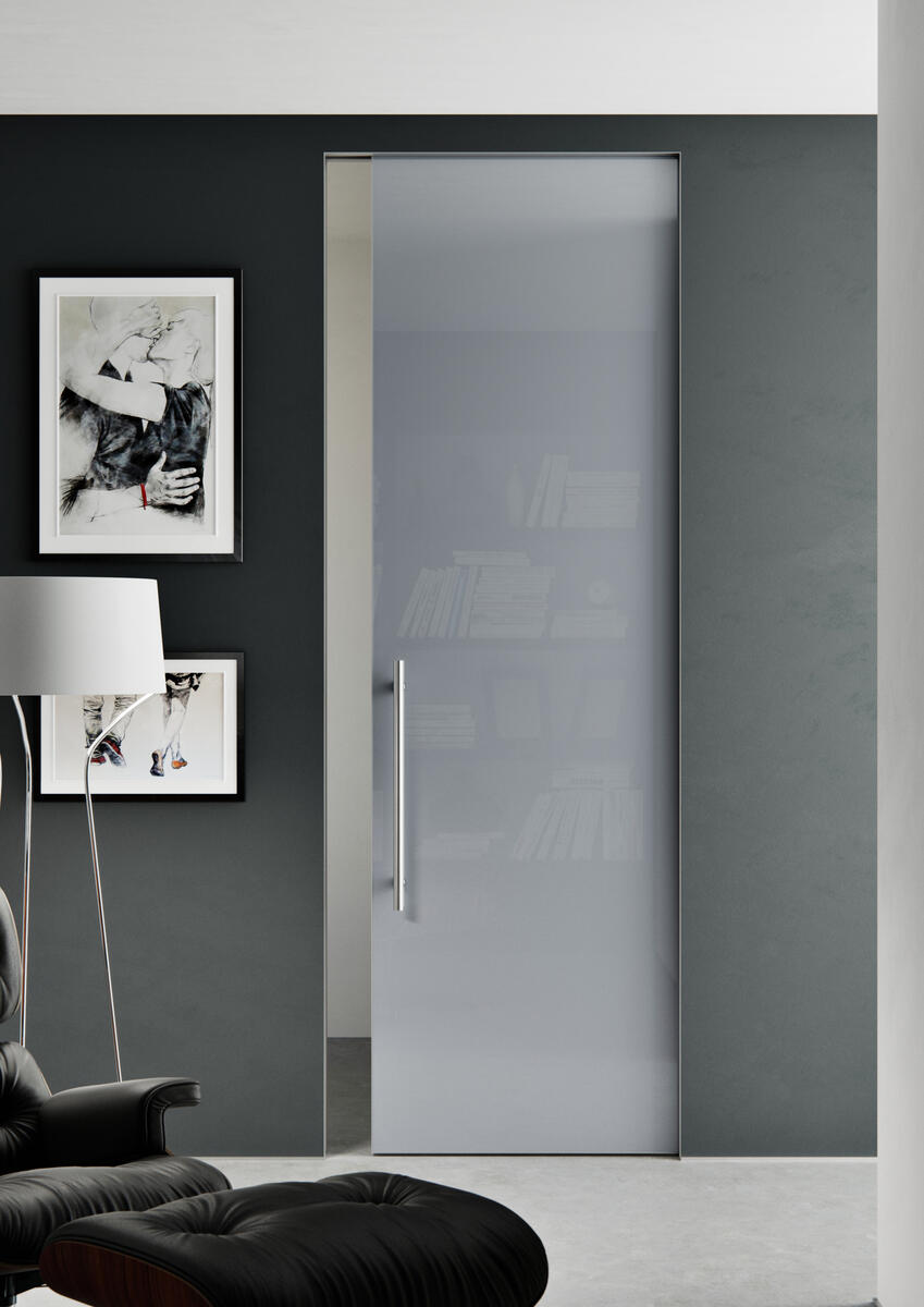 Verkleidungsloser Schiebetürkasten für einflügelige Schiebetüren, der perfekt auf die reine Wandfläche ohne Verkleidungen abgestimmt ist. Design-Modell, ideal für minimalistisch gestaltete Interieurs. Der Kasten ist so angepasst, dass seine versteckte Konstruktion die Kante der Durchgangsöffnung bildet und auf Wunsch unter der Oberflächengestaltung der Trennwand verborgen werden kann. Bei gemauerten Trennwänden muss die bauliche Türöffnung mit einem Sturzträger versehen sein – der Schiebetürkasten kann keine Last tragen.