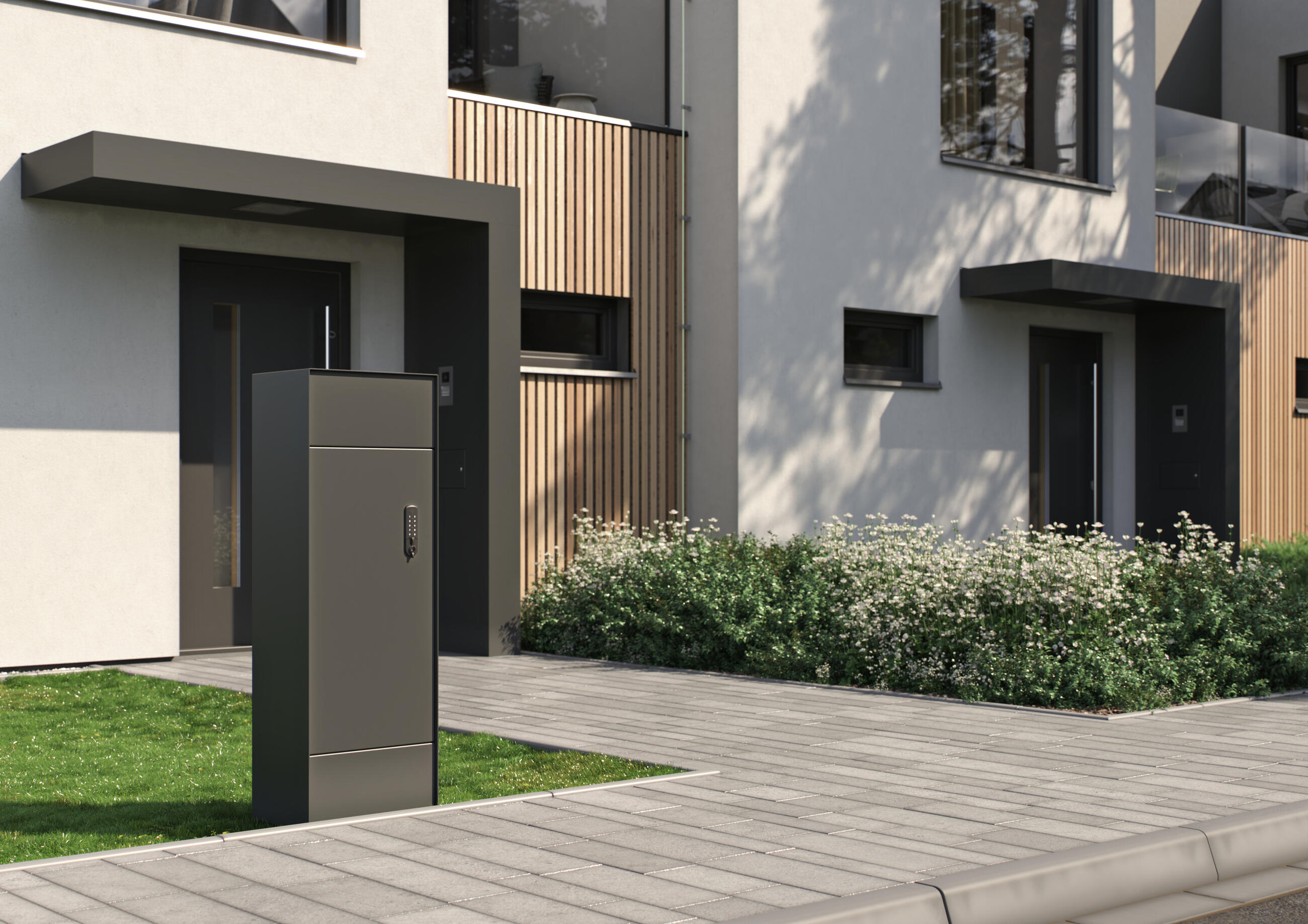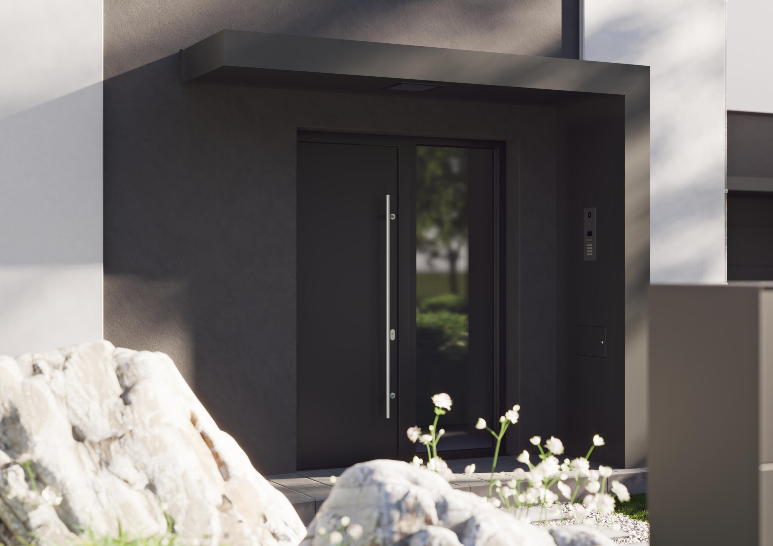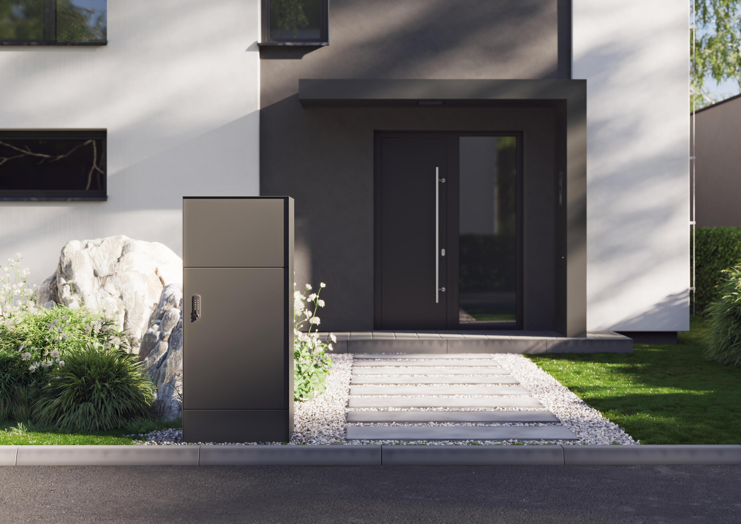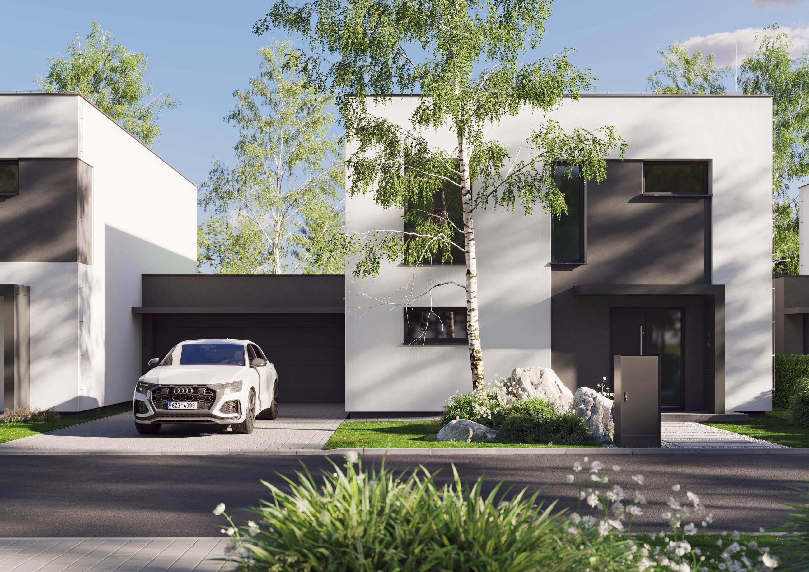 Modul, das verschiedene Komponenten enthält - eine Hausnummer, einen Briefkasten, ein Vordach, eine Sensorleuchte und eine Klingelvorbereitung. Der Platz wird vor Wind, Regen und Sonne geschützt sein. Das Modul kann verschiedene Breiten, Tiefen und Ausrichtungen haben und je nach Anzahl der Familien im Haus können ein oder zwei Systeme gewählt werden. Für diese Variante kann auch das Element Label verwendet werden.