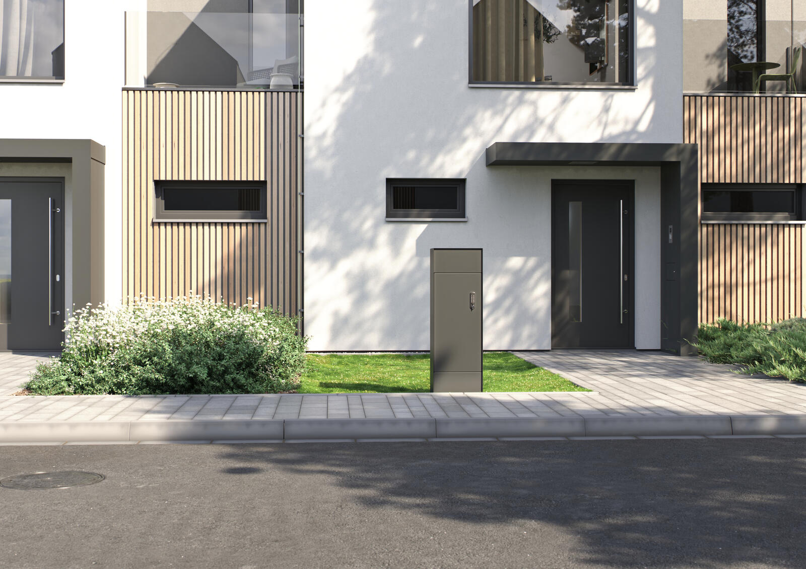 Modul, das verschiedene Komponenten enthält - eine Hausnummer, einen Briefkasten, ein Vordach, eine Sensorleuchte und eine Klingelvorbereitung. Der Platz wird vor Wind, Regen und Sonne geschützt sein. Das Modul kann verschiedene Breiten, Tiefen und Ausrichtungen haben und je nach Anzahl der Familien im Haus können ein oder zwei Systeme gewählt werden. Für diese Variante kann auch das Element Label verwendet werden.