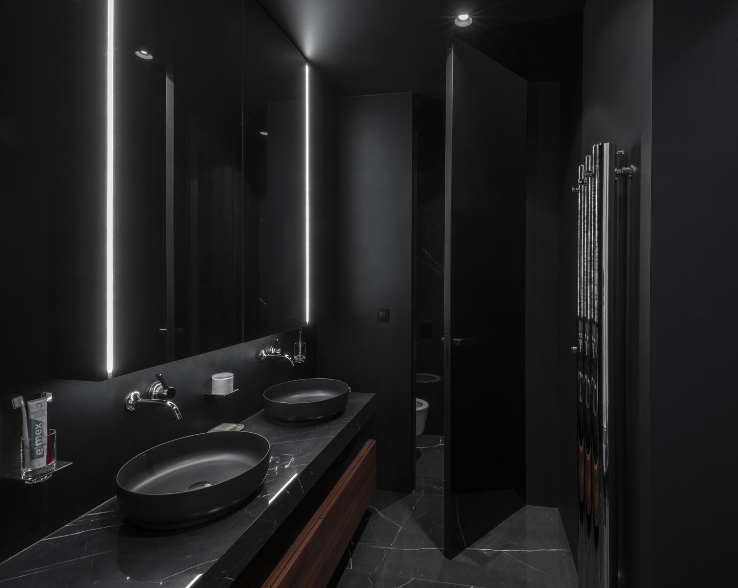 „Der Kunde bat uns, das Interieur in einem reinen Schwarzweiß-Design zu halten, sehr klar und minimalistisch. In dieses Konzept passen auch die JAP-Türen mit verdeckter Zarge. Ihre Höhe unterstreicht die gesamte Eleganz und vergrößert den Raum optisch. Die schwarzen Griffe und Rahmen ergänzen das Konzept und geben den Türen die Möglichkeit, auf sich aufmerksam zu machen.“