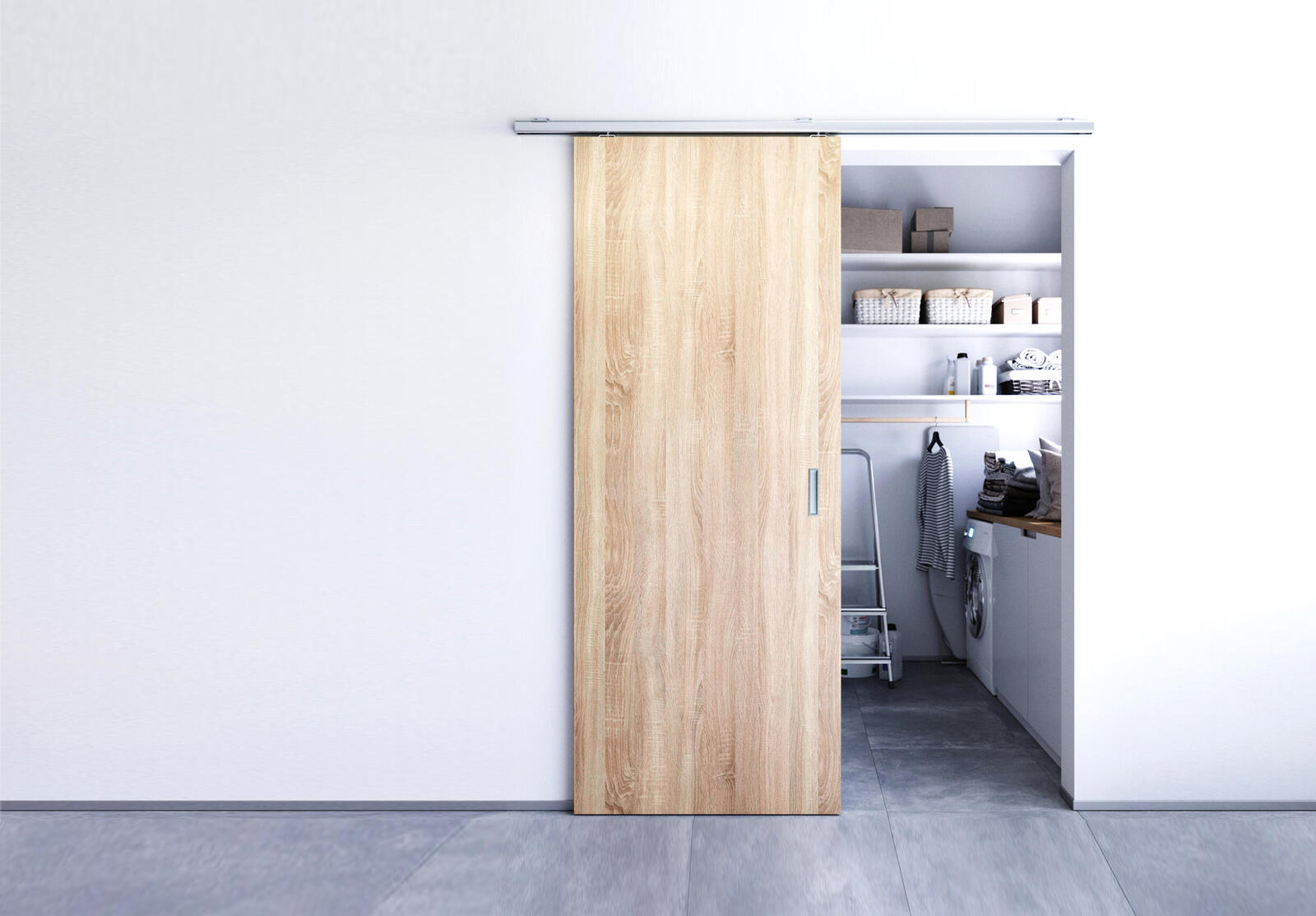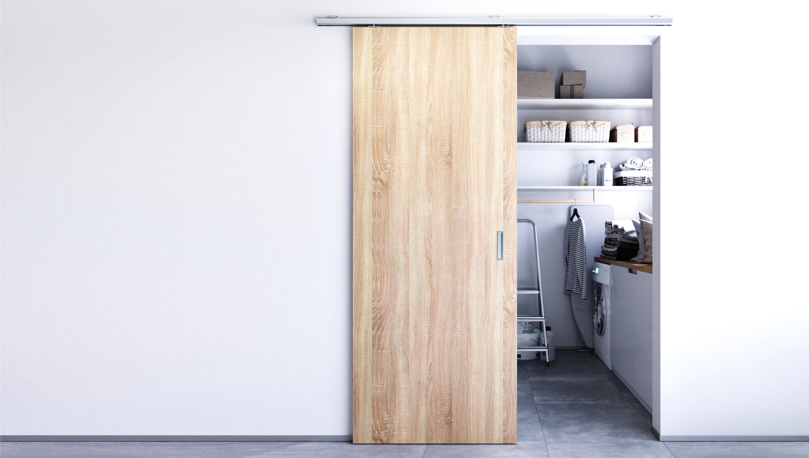 Aluminiumprofil-Laufschiene mit gewählter Verankerung (Mauer, Decke). Die Halterungen für Holz sind im Lieferumfang enthalten, für Glas werden die sog. Halterungen Vetro 22 nachbestellt. Softstopps sind nicht im Lieferumfang enthalten.