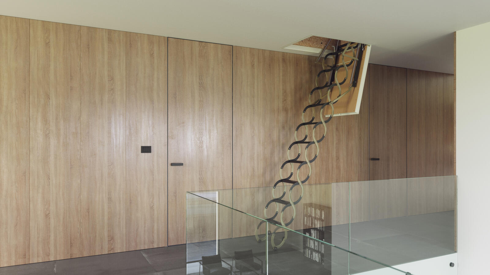 Treppe mit Blech-Sandwich-Klappe zum Einbau in die Decke. Das Innere der Klappe besteht aus einer Wärmedämmung mit Brandschutzisolierung. Die Fuge zwischen Klappe und Rahmen ist mit einem feuerbeständigen Schaumband abgedichtet. An der Rahmenkonstruktion ist eine mit der Klappe verbundene Scherentreppe befestigt. Der gesamte Treppenbereich ist von oben mit einer wärmegedämmten Klappe verschlossen. Die untere Klappe ist auf der Sichtseite weiß lackiert und mit einer Schutzfolie versehen, die Holzteile der oberen Klappe sind mit einer Fungizidlösung behandelt, das verwendete Sperrholz ist wasserfest.