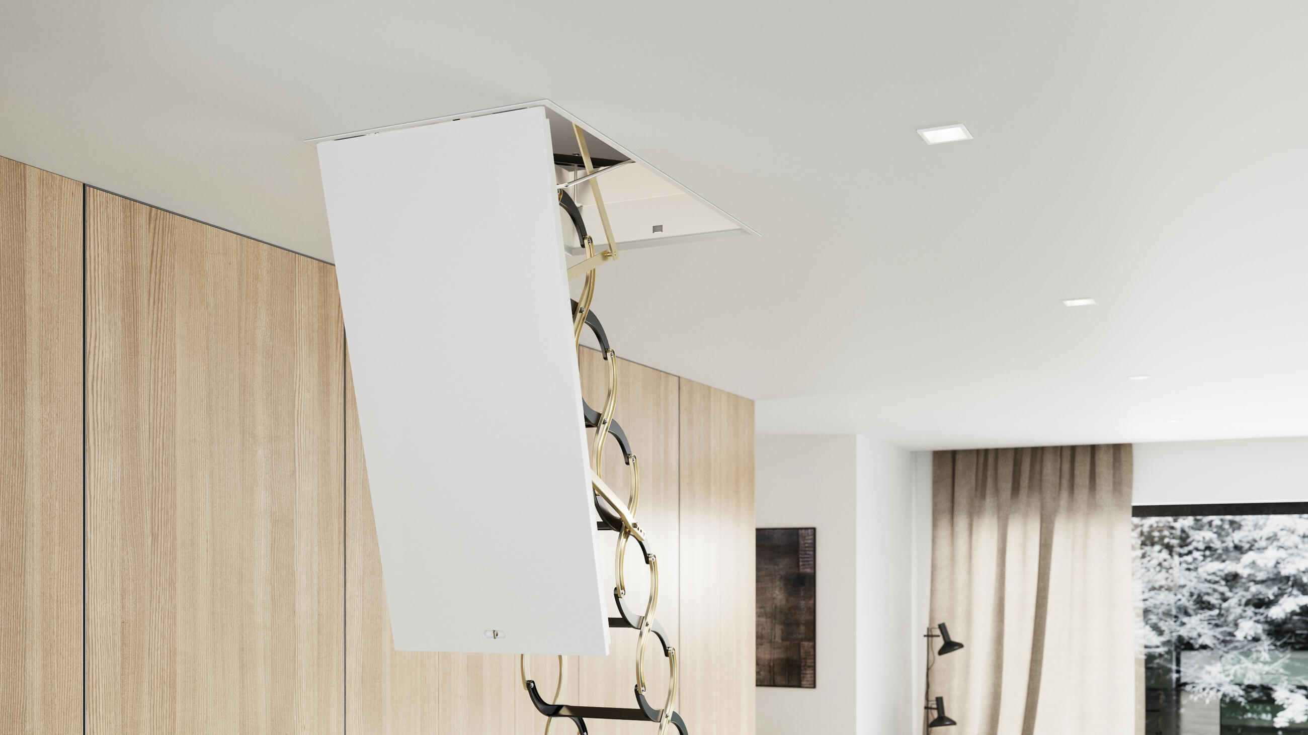 Das Innere der Klappe besteht aus einer Wärmedämmung. Das Klappenöffnungssystem ist ab einem Maß von d ≥ 1000 mm mit einem Bremsmechanismus gegen ruckartiges Öffnen versehen. Sandwich-Klappe: Der mit Dämmstoffen gefüllte Holzrahmen ist mit verzinktem Blech verkleidet. Die Untersichtseite ist weiß lackiert und mit einer Schutzfolie versehen. Auf Wunsch kann auch nur die wärmegedämmte Bodenluke ohne Dachbodentreppe geliefert werden.