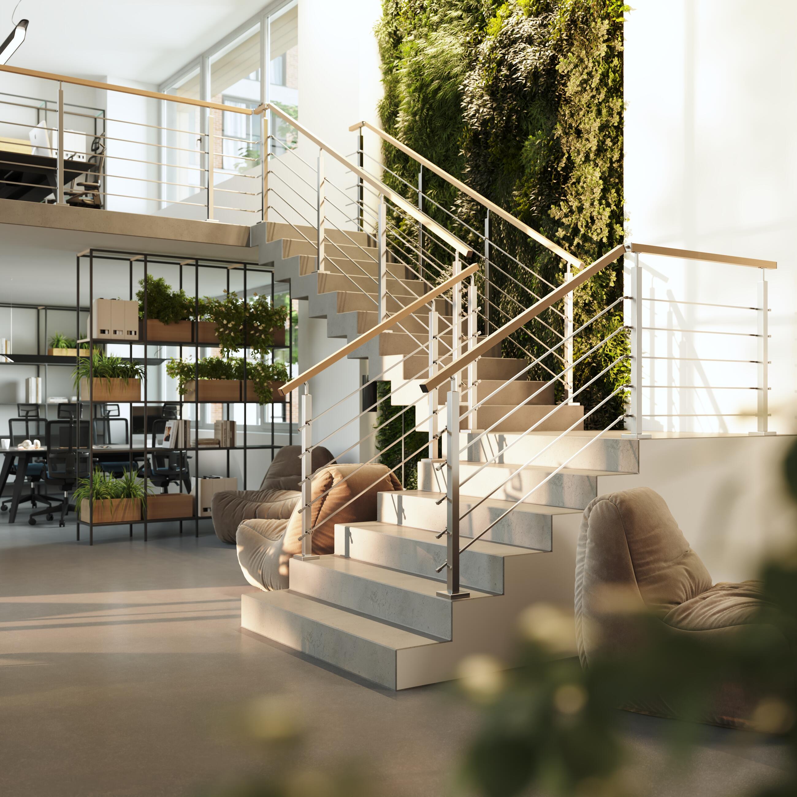 Das Innengeländer SQUARE hat eine Grundkonstruktion aus eckigen Pfosten, einer horizontalen eckigen Stabfüllung und einem Handlauf aus Edelstahl.