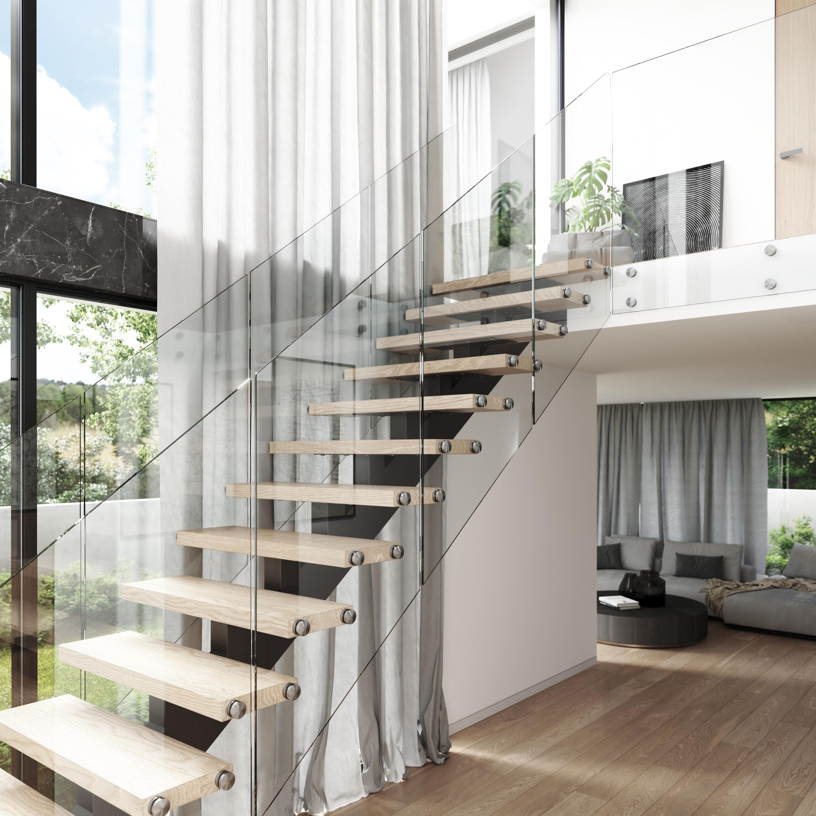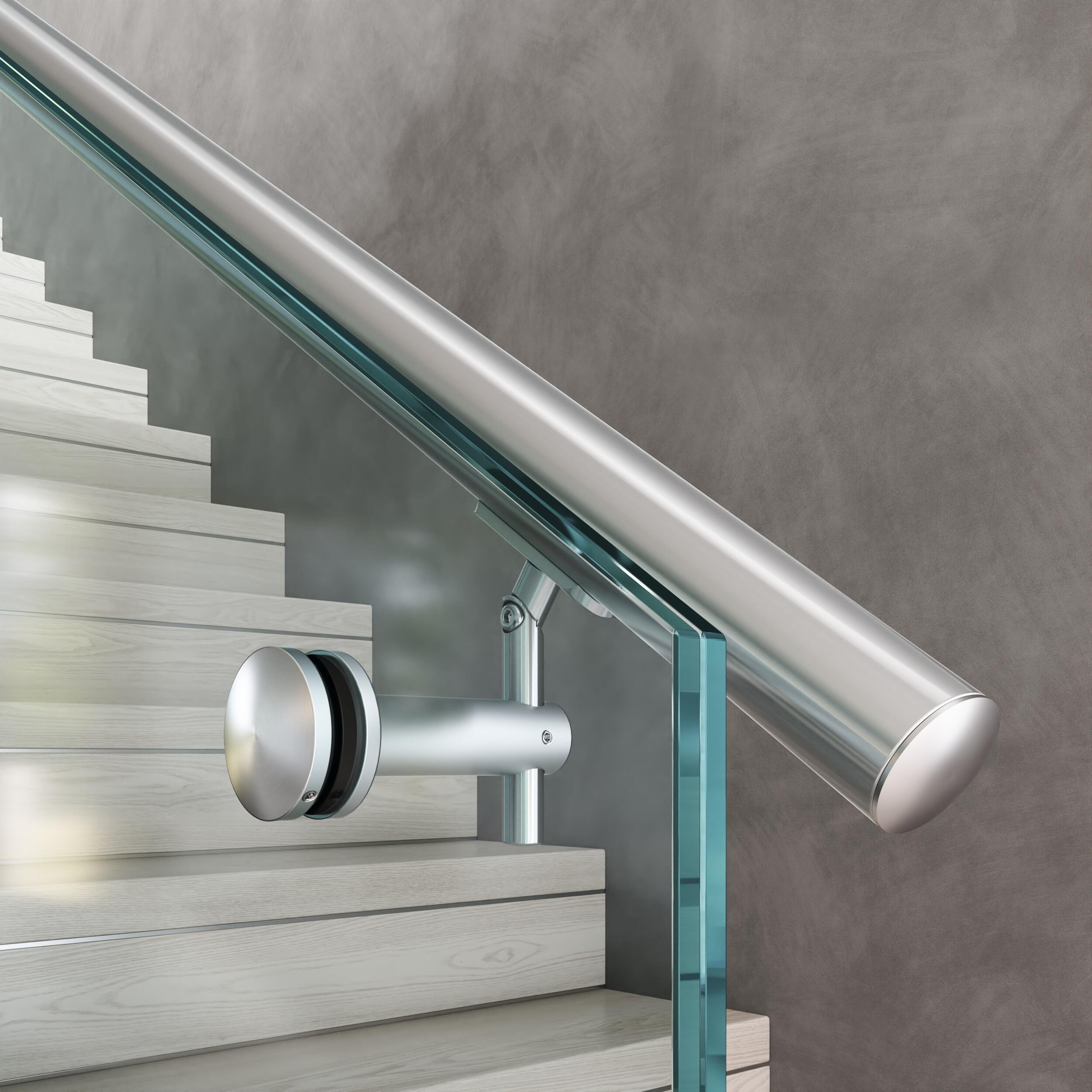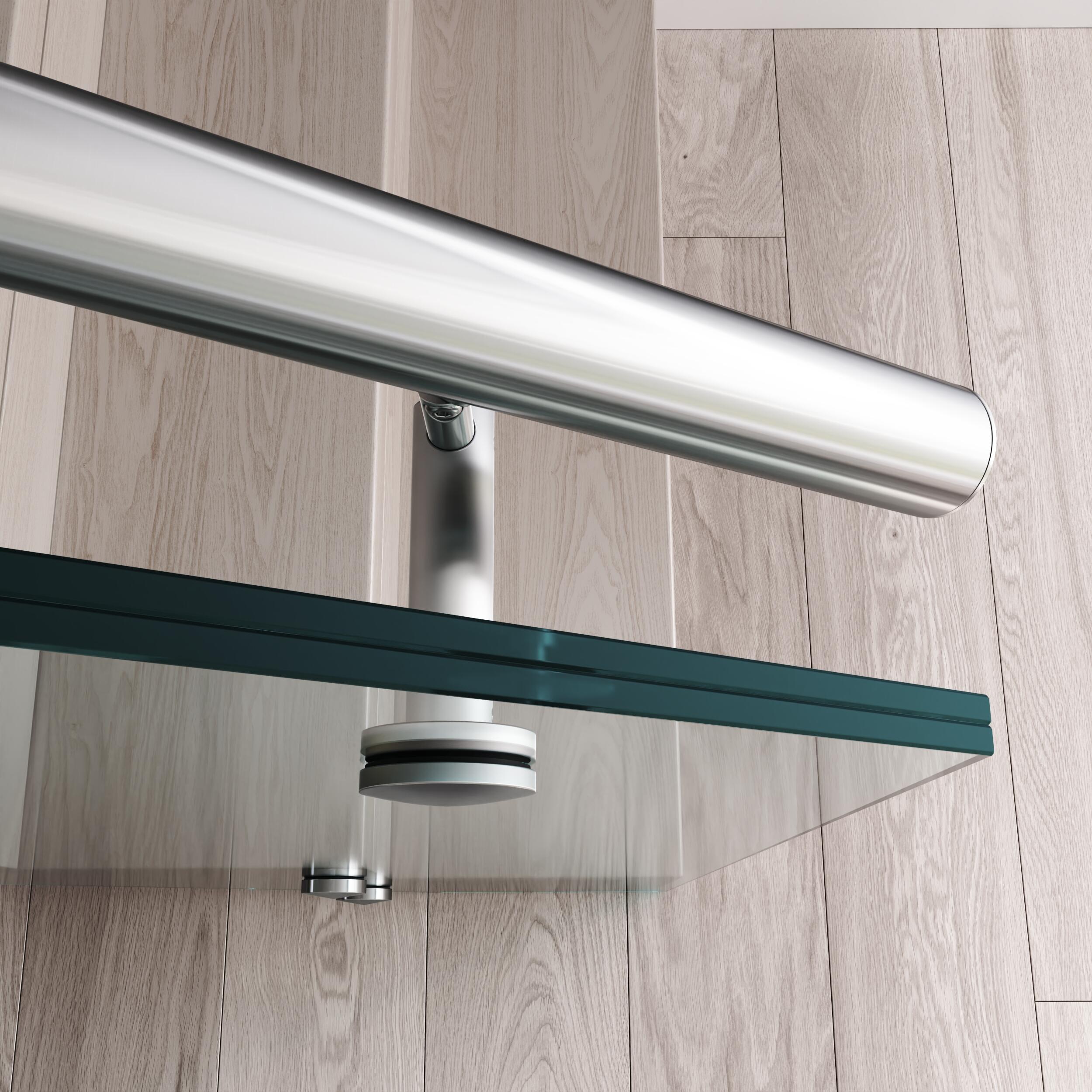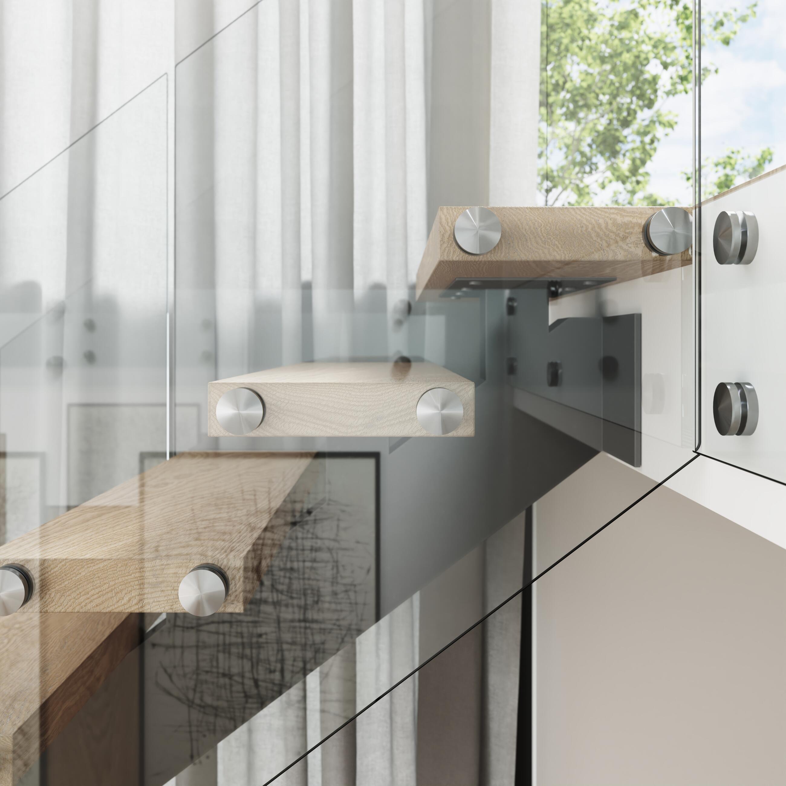 Das Ganzglasgeländer lässt sich durch einen Handlauf ergänzen, der von oben direkt auf das Glas oder auf vorstehende Halterungen aufgesetzt werden kann. Es empfiehlt sich, die Glaskante mit einem U-Profil vor Beschädigungen zu schützen. Handlauf, Abdeckprofil und Punkthalter werden beim Modell TRANSPARENT auch in RAL-Farbtönen nach Kundenwunsch gefertigt. Das Innengeländer TRANSPARENT hat eine Grundkonstruktion aus zwei Verbundsicherheitsgläsern, die auf Edelstahl-Punkthaltern an der Seite der Treppe befestigt werden.
