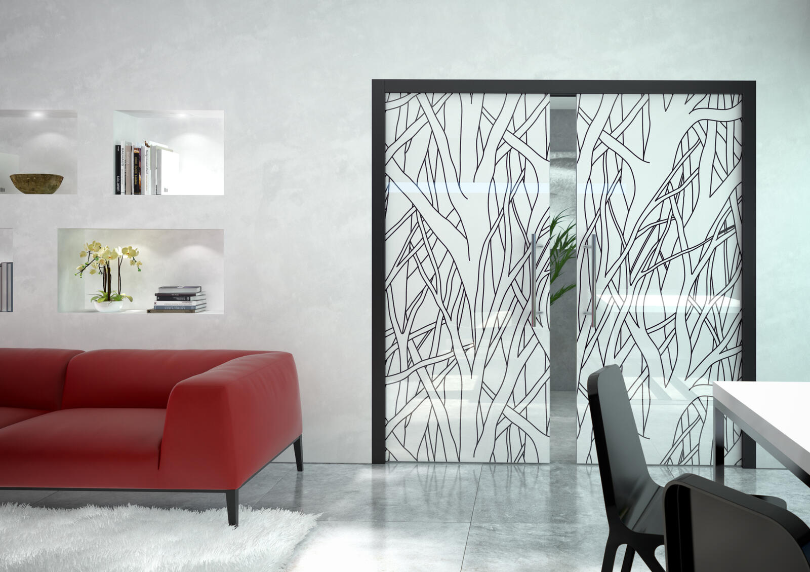 Schiebetürkasten in der Ausführung für zweiflügelige Schiebetüren, wobei eine herkömmliche Holzzarge in einer Ebene mit der Wandfläche liegt und die obere Verbindung zwischen den Teilen eine sog. stumpfe Verbindung ist. Die Bewegung der Türblätter kann auch synchron erfolgen, sodass sich beide Türblätter gleichzeitig schließen oder öffnen. Dieser Schiebetürkasten ermöglicht die Montage einer Verkleidungszarge in einer Ebene mit der benachbarten Zwischenwand und ist für eine 15 mm starke Verkleidungszarge vorgesehen. Bei gemauerten Trennwänden muss die bauliche Türöffnung mit einem Sturzträger versehen sein – der Schiebetürkasten kann keine Last tragen. Der Schiebetürkasten knüpft hinsichtlich des Designs an die Gegenzarge Latente für Anschlagtüren an.