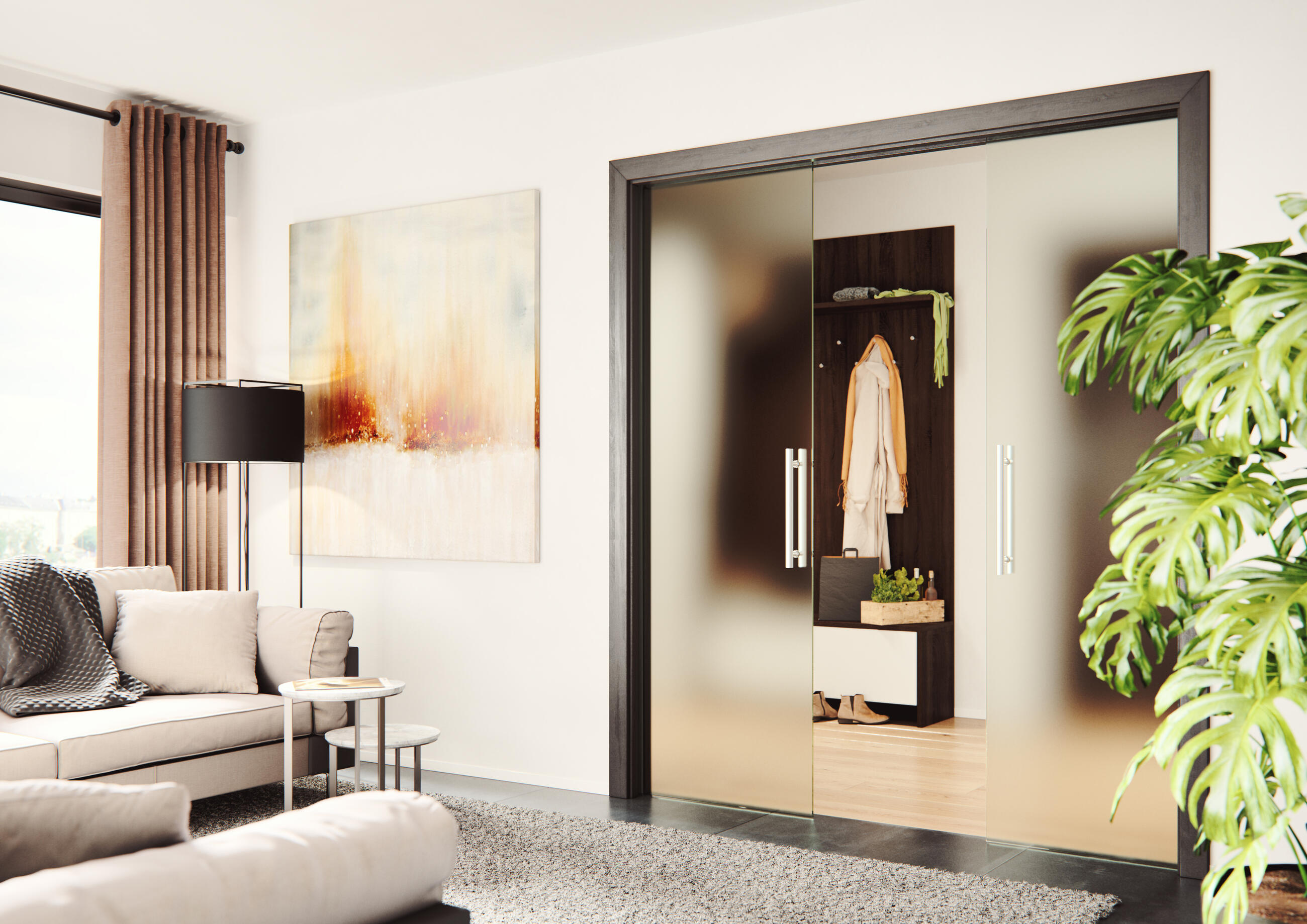 Zweiflügelige Schiebetürkästen für zwei Türblätter eignen sich besonders dort, wo ein großer Durchgang gefragt ist, etwa zwischen Küche und Wohnzimmer. Bei Bedarf kann die Tür einfach geschlossen werden, sodass zwei getrennte Räume entstehen. Ist hingegen ein großer Raum erwünscht, „verschwindet“ die Tür in der Wand und stellt keinerlei Hindernis dar.